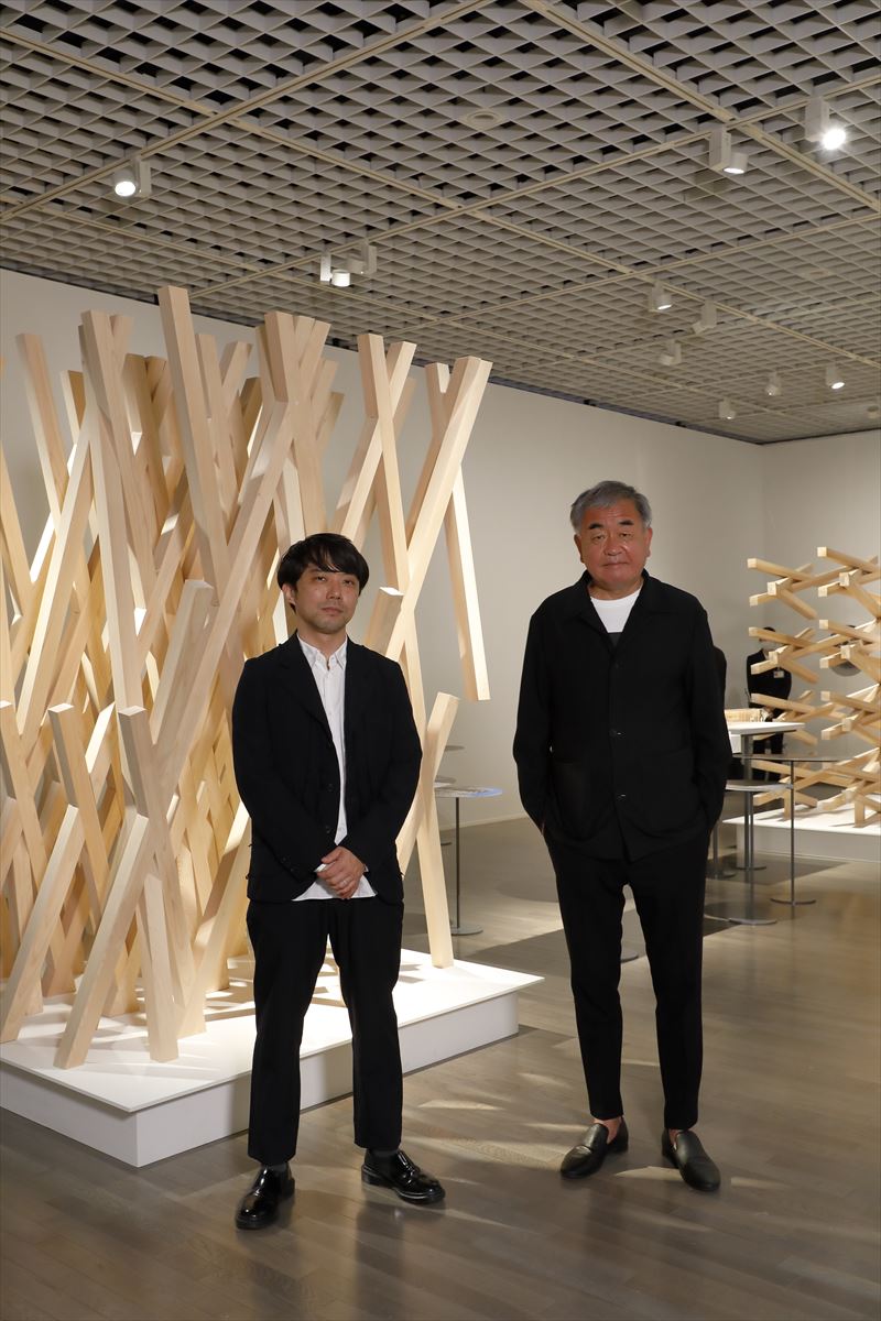 隈研吾氏(右)と企画担当者の保坂健二朗氏。保坂氏は2021年1月から滋賀県立美術館のディレクター(館長)を務めているが、東京国立近代美術館在籍時に、主任研究員としてこの展覧会の企画の中心になった(©Kioku Keizo)東京・竹橋の東京国立近代美術館で6月18日から「隈研吾展 新しい公共性をつくるためのネコの5原則」が始まった。どうやら東京五輪は開催されそうなので、「国立競技場」の設計者の1人である隈氏への注目はますます高まりそうだ。