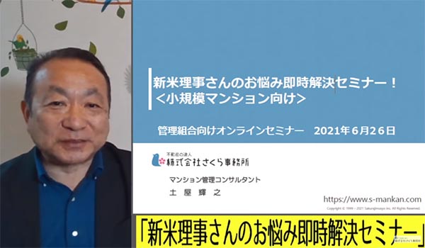 そのような声を受け、2021年6月26日、「小規模マンションにおける組合運営のコツから、管理費・修繕積立金の節約方法まで~新米理事さんのお悩み即時解決セミナー」と題したオンラインイベントが行われた。登壇されたのは、株式会社さくら事務所のマンション管理コンサルタントの土屋 輝之さん。大小合わせて400を超えるマンション管理組合の運営コンサルティングを手がけてこられた。