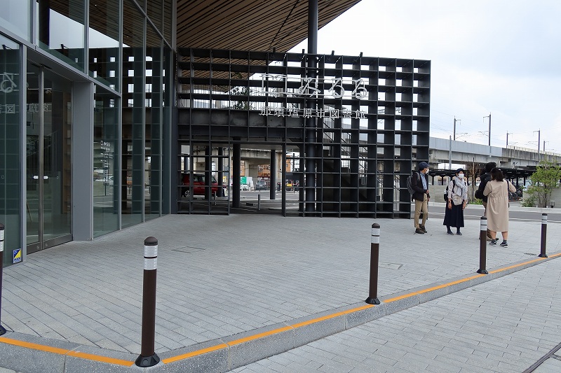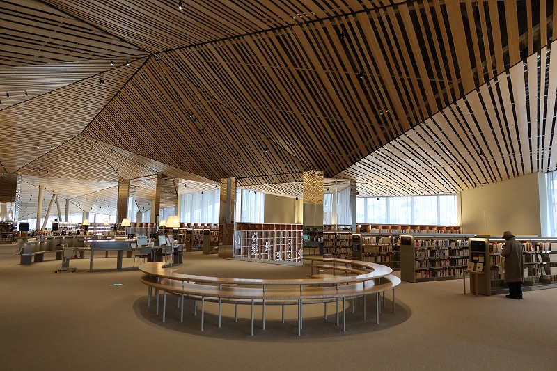 私は最初、駅から最も遠い南西側のエントランスから入ったのだが、建物1階中央は駅までの、見通しの良い広い通路となっており、内部から外も、外から内部もよく見えるようになっている。蔵書を守るためだろう、閉鎖的な印象のある図書館が多い中にあって見た目からして異なる雰囲気なのである。