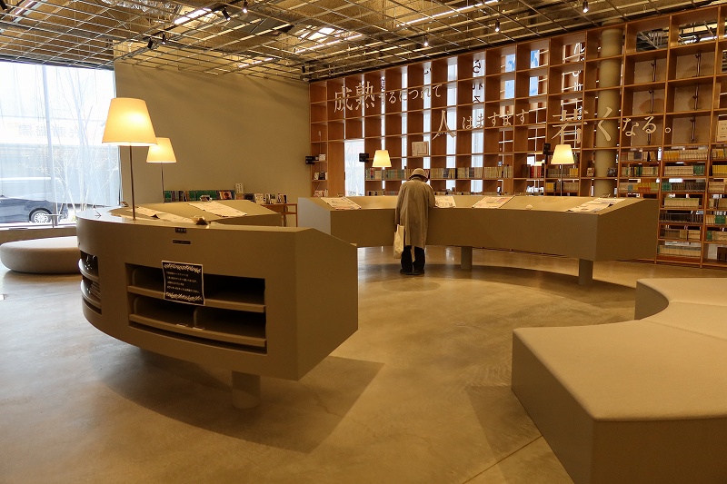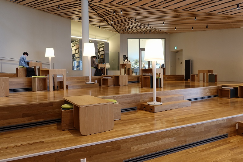 開放的な1階に比べると2階は落ち着いた雰囲気の、1階よりは図書館らしい空間である。建物の、駅に近い3分の1ほどは貸出等を行うカウンター、ブラウジングコーナーを中心にやはり棚の中身が見えるような形で書棚が広がっており、ところどころに座る場所も。ここは中央から外に向かってより集中できるように家具も含めて設計されている。