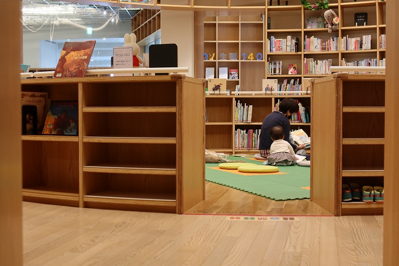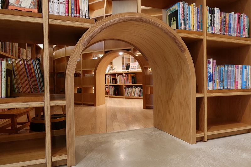 1階には子ども用の2つのコーナーも作られている。ひとつはゼロ歳から6歳、もうひとつは6歳から13歳のための場で、いずれも隠れ家的な、自分のテリトリーとして感じられる閉じた感じの場所。隅っこに入りこみたがる子どもからするとわくわくするような空間である。これはお母さんたちから子どもの居場所、連れて行く場所がないという声を受けてのもので、小さな子ども用の空間には大人は入れないようなトンネルも作られていた。本の中に入り込めるよう、本棚の中にベンチが作られてもおり、こんなところで本の世界に浸れたら本好きの子どもが増えそうである。