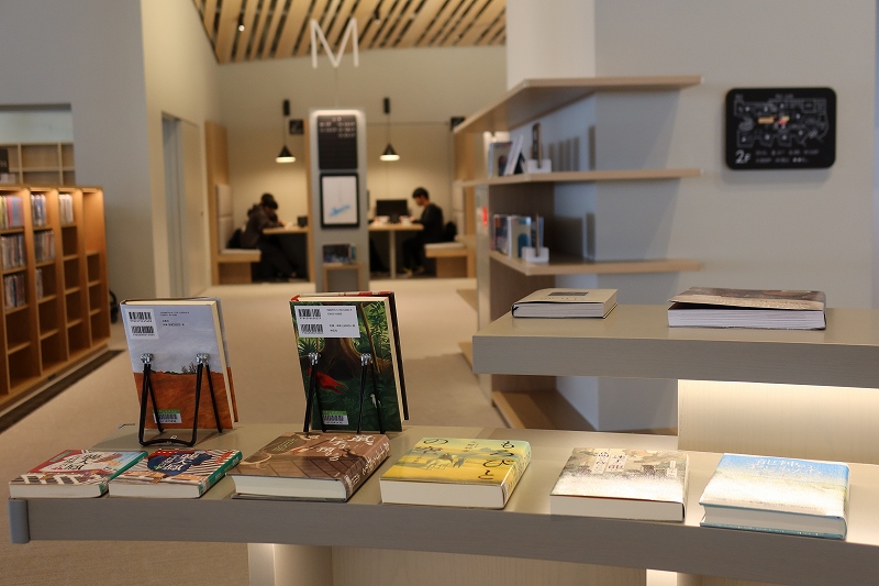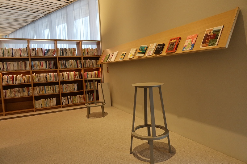 逆に本は少なく、ブックディレクターの幅允孝さんが選書したものに加え、図書館職員が選んだものなどが飾るように置かれている。壁には置かれた書籍の一文が抜き出してディスプレイされており、興味を惹く仕組みに。