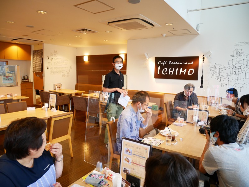 モーニングをいただくために朝食抜きで集まった参加者たち。各々、ドリンクをオーダーしモーニングを味わいながら大竹さんの話に耳を傾ける。中央に映るのがガイドの大竹敏之さん。「名古屋の酒場」「名古屋の喫茶店」「東海の和菓子名店」など名古屋の食文化に関する著書が多数まず1軒目に訪れたのは一宮駅の駅ビルの中にある「ICHIMO(イチモ)」。一宮モーニングのアンテナショップとして親しまれている店だ。