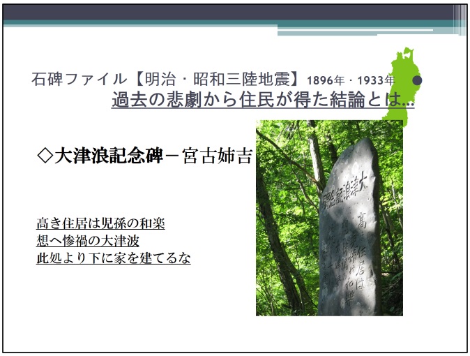 1896年の明治三陸大津波、1933年の昭和三陸大津波の教訓を生かして集落ごと高台移転し、東日本大震災で難を逃れた例がある。それが宮古市の重茂半島(おもえはんとう)にある姉吉地区。ここには「ここより下に家を建てるな」と明確な警告を刻んだ大津波記念碑があり、その警告に従ったことが集落の人々の命を救った(*)。