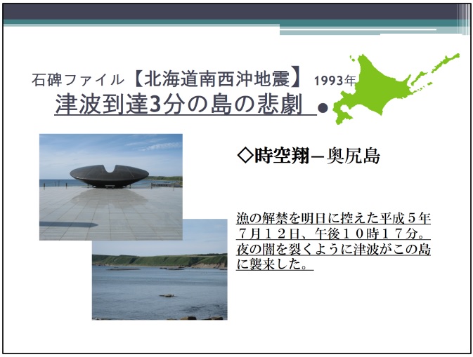 2021年7月、同書を元に開催されたオンラインイベントの様子から、全国の石碑のうちのいくつかを紹介、災害を伝承するということについて考えていきたい。まずは北海道奥尻島で大きな被害を出した北海道南西沖地震。