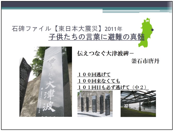 三陸では東日本大震災を受けて釜石市唐丹(とうに)に建立された石碑の話も印象に残った。この石碑には地元の小中学生の子どもたち91人、大人4人の思いが刻まれているそうで、森氏はそのうち、「100回逃げて、100回来なくても101回目も必ず逃げて」という中学2年生の言葉を紹介した。繰り返しの警告にまたかと思い、危険を感じなくなってしまう人も多いが、災害はいつやってくるか分からない。子どもたちにならい、何度でも逃げるようにしたい。