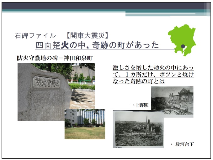 関東大震災に関しての森氏の説明ではもうひとつ、「防火守護の地」という石碑を紹介しておこう。焦土と化した市街地の中で千代田区神田佐久間町と神田和泉町の一画に焼けなかった一画があり、石碑はそれを記念するものだという。
