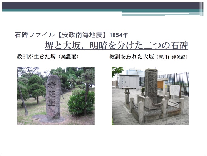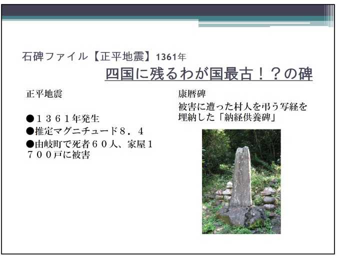 それ以外にも、昭和南海地震を記録する徳島県海陽町の南海道地震津波史碑、室町時代に四国沿岸を襲った正平地震津波の惨状を伝える、現時点では日本最古の津波碑とされる徳島県美波町の康暦碑、沖縄に甚大な被害をもたらした1771年の八重山地震を伝える明和大津波遭難者慰霊之塔などさまざまな碑が紹介された。聞いていて思ったのは日本全国、地震や津波その他の自然災害に遭わなかった場所はほとんどないのだということ。北海道から沖縄まで多い少ないはあるにせよ、歴史を辿ればなにかしらの被災をしている。それを意識し、備えることが石碑を残した人たちの思いに応えることなのだろう。