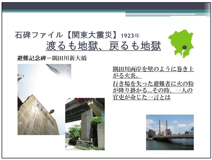 首都圏に多いのは1923年の関東大震災の石碑である。森氏が最初に紹介したのは東京都中央区の浜町公園に近い隅田川の新大橋に建つ避難記念碑。関東大震災では発災後すぐに火災が発生、大きな被害を出したことが知られているが、炎に追われた人たちが辿り着いたのが隅田川にかかるこの橋のたもと。日本橋側、対岸の両国側ともに火が出ており、その火の粉が避難する人たちの荷物に降りかかる。