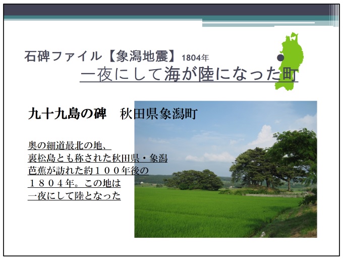 もっと古い地震を記録した石碑もある。日本海側、秋田県にかほ市象潟町、蚶満寺にある九十九島の碑である。象潟は俳人芭蕉の「奥の細道」の最北の地で、芭蕉が訪れた当時は宮城県の松島にも比類する、海に島々が浮かぶ景勝地だったのだとか。ところがその約100年後、象潟の景観は大きく変わる。1804年にマグニチュード7.1という大地震、象潟地震が起きたのである。