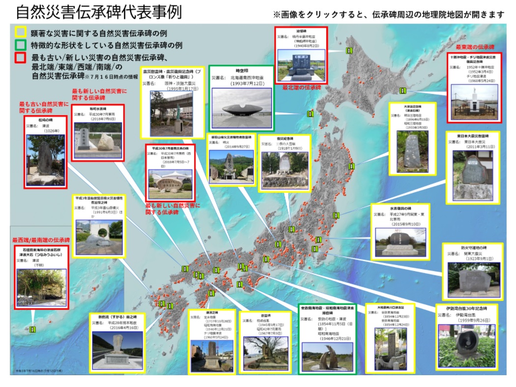 もうひとつ、災害と記録という意味では国土地理院が2019年3月から新たに地図記号を定め、同院発行の2万5,000分の1地図に掲載を始めた自然災害伝承碑も役に立つ。趣旨はここまで説明した石碑情報と同じで、2021年7月16日現在で47都道府県299市区町村1,000基を掲載しており、日々増加している。web上のマップでは地図記号をクリックすると災害の概要が分かるようになっており、あるものについては関連リンクが掲載されている。なお、この1,000基の石碑情報も前掲のアプリ「みんなでつくる~防災の原点!石碑マップ~」に反映される予定だ。