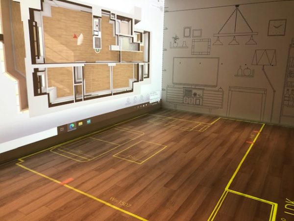 もうひとつの機能が、「プロジェクションマッピング」である。先ほどの「PLANNING ROOM」の、今度は床面に投影する。床面には、実寸大で部屋の輪郭が映し出され、その中に必要な家具などを配することができる。