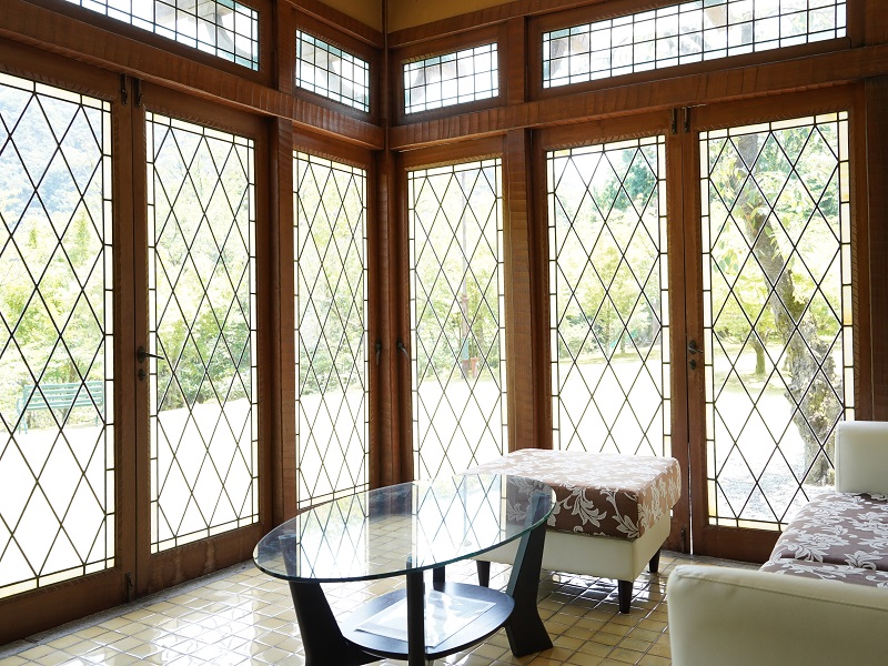 建物の東側に位置するサンルームは、貞奴思い出の木曽川と対岸の山を望む、素晴らしい景観を誇る。たっぷりと光が降り注ぐ二面に備えられたガラス戸は、ひし形に桟が組まれている。ガラス自体もひし形にカットしてはめ込まれており、ステンドグラスと同じ趣向だという。また、サンルームのひさしもガラス製となっている。