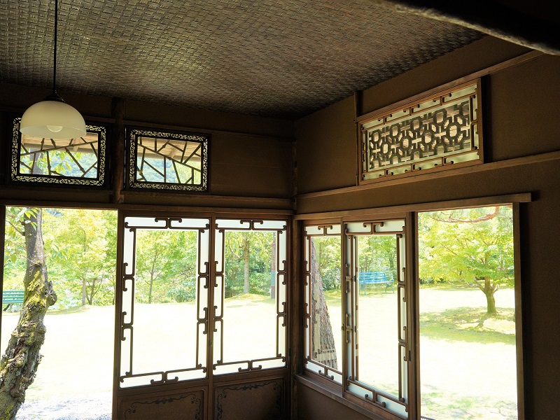 ガラス障子の上のガラス窓や欄間には羅漢竹で氷が割れる文様が入れられていたり、襖の引き手に麒麟が描かれていたりと、異国情緒がある。名古屋の二葉御殿にも「志那室」という中国風の小部屋が造られていた。大正から昭和初期には中国風の様式を取り入れる流行があったというから、その流れだろうか。