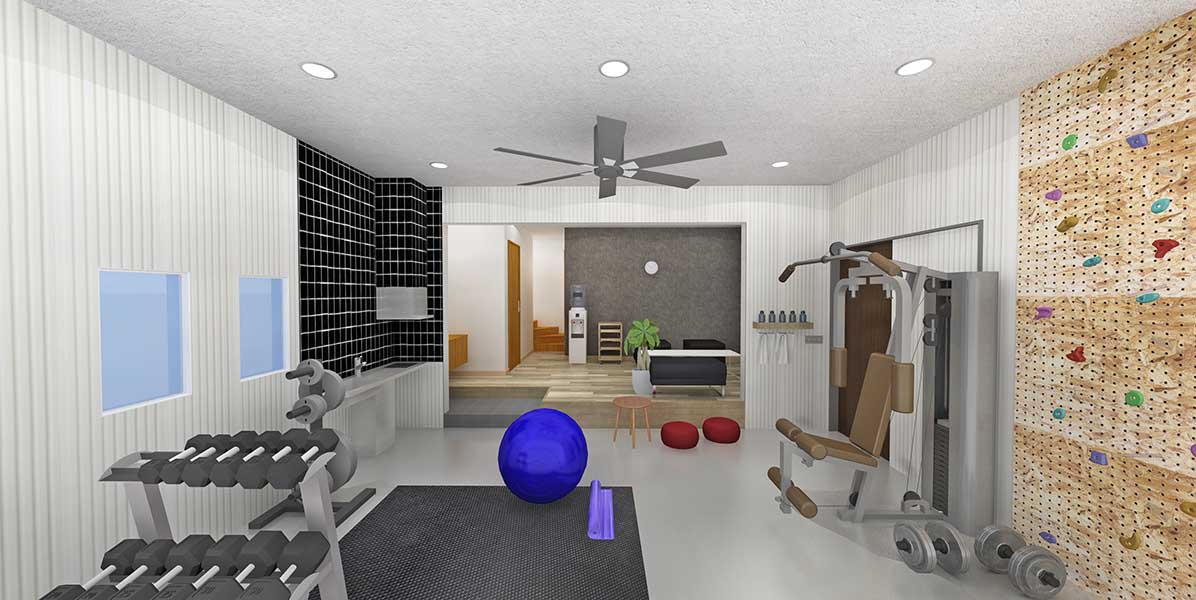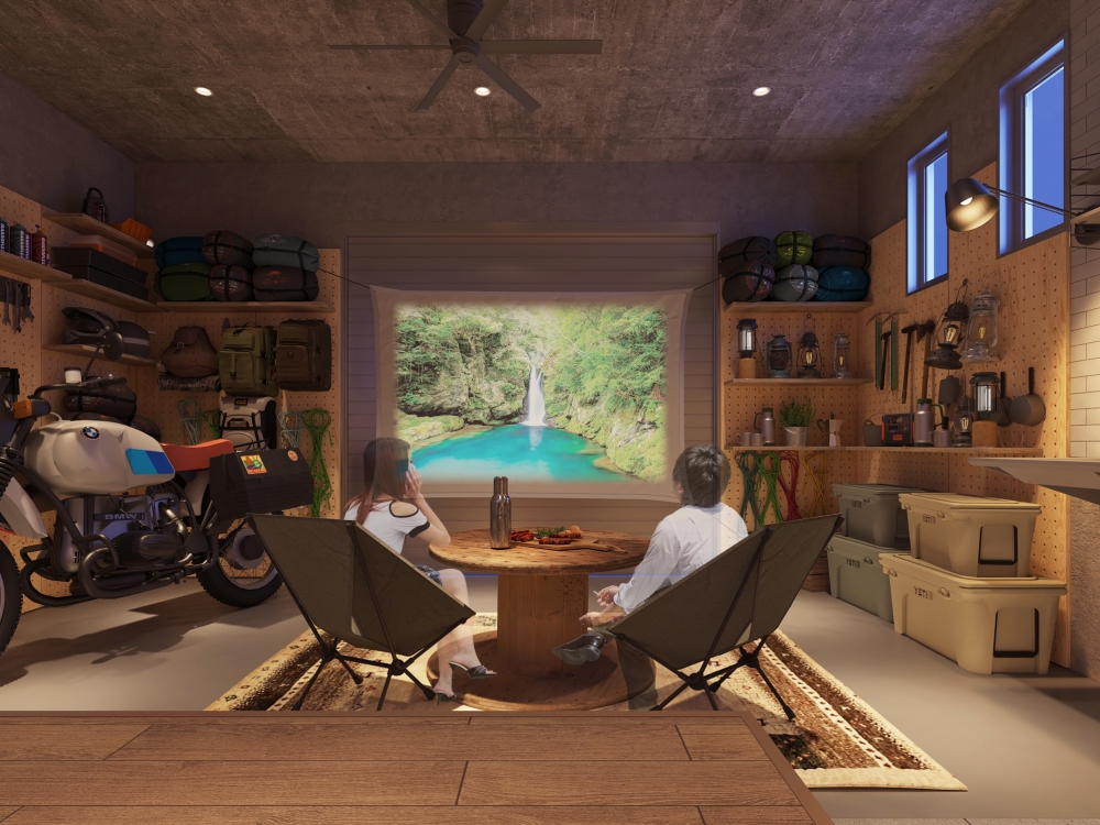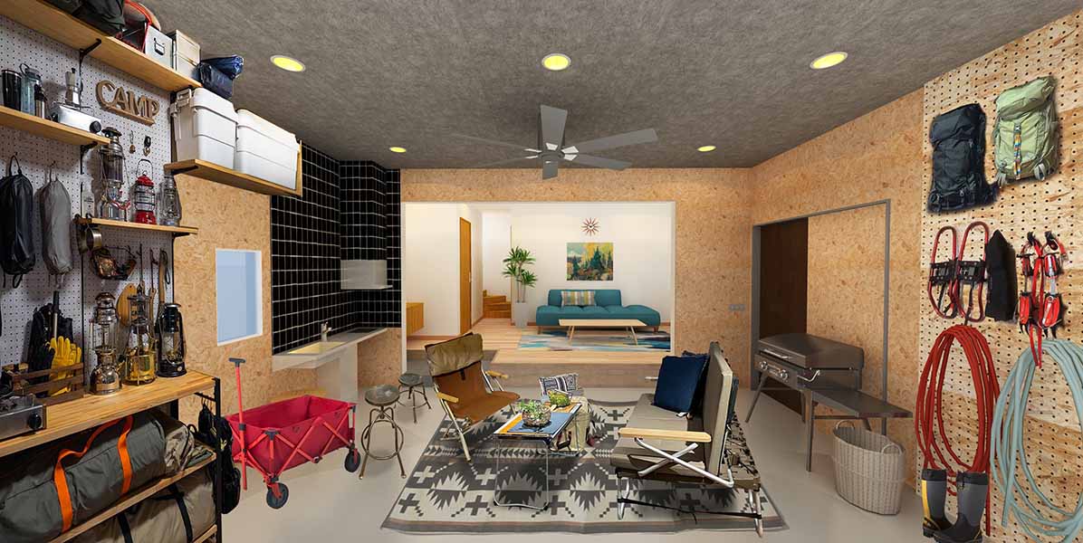 「ソファやテーブルなどを置いて友人や恋人などと談笑できるほか、便利なミニキッチン付きなので、雨が降っている日にガレージキャンプも楽しめます。空気が通りやすいので、大切なアウトドア用品の保管にも便利です。筋トレが好きな方には、自分だけのトレーニングジムをつくっても楽しいと思います」(飯塚さん)