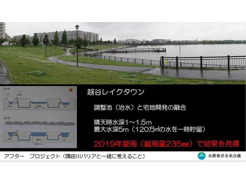 事例紹介の中には、妙正寺川調整池として日常的にはスポーツ公園として活用している事例や、越谷レイクタウンの事例もあった。氏は遊水池の魅力付けの可能性を強調する。