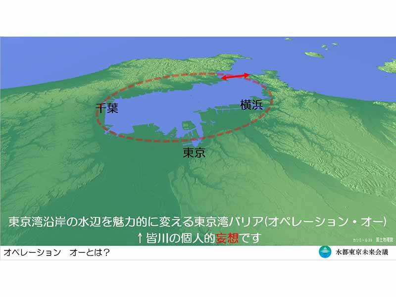 「だからサークル状の内海を完結させるためバリアは外海出口に造るのが効果的」と皆川氏は、富津と三浦半島の一番接近しているところに防潮堤を造る妄想を披露した。名づけてオペレーション・オー。東京湾が隅田川バリアでつながることによって、大きなOになるのである。