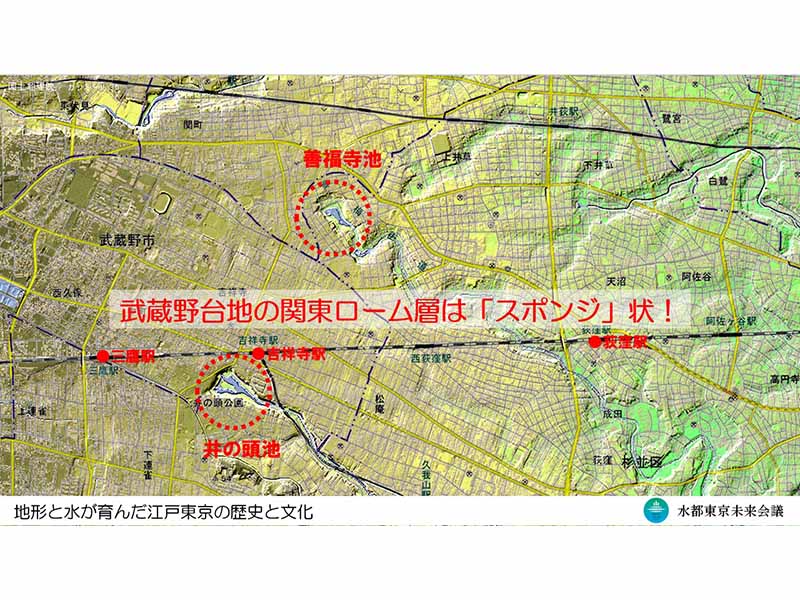 「関東地方特有の関東ローム層は水を通しやすく、スポンジ状に水をたくわえます。大地に降った雨は標高の高いところから下っていき、標高50mあたりから湧水となり、地表面に現れます。石神井川、善福寺川、妙正寺川、神田川、白子川などがそうした例です。神田川の源流は井の頭池ですが、行ってみれば分かるようにあそこは階段を下りたところに池のある大きなスリバチ。今では湧水はだいぶ少なくなっているようですが、湧水がつくったスリバチというわけです」