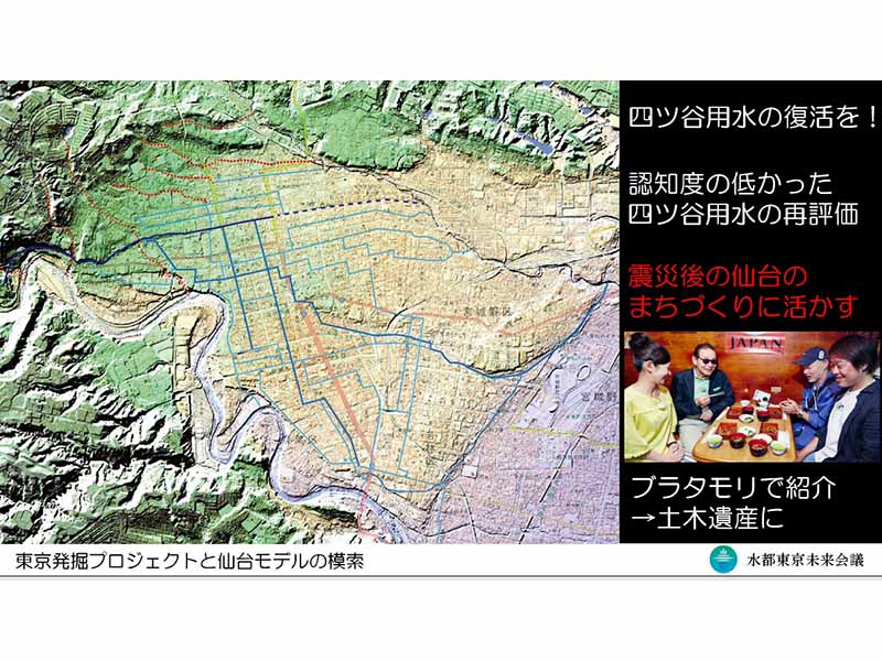 ここまででも東京の魅力を再発見するようなワクワクする話題が続いたが、氏が前半のラストで紹介したのが玉川上水復活の話題。玉川上水は2040年代を目標に、かつての流れを復活させる取り組みが2021年より動きだしている。これは水都東京未来会議の委員のひとり、日本大学の山田正教授のチームが東京都に提言し、都は2019年に策定した「『未来の東京』戦略ビジョン」に玉川上水系の清流復活を盛り込んだ。