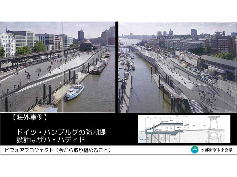 だが、それが造られる以前でも水辺を魅力的にできる取り組みはあるはずと、皆川氏はいくつかを提案した。ひとつは既存の河川沿いの施設をリノベーションし、橋詰広場や水辺の公園を親水化する計画。いざというときは水没することを前提に広場や公園を階段状に掘り下げ、誰もが水辺に近づきやすくし、船着き場も設置するという構想だ。ここではザハ・ハディド氏設計によるドイツ・ハンブルグ市のすでに実践されている事例が紹介された。