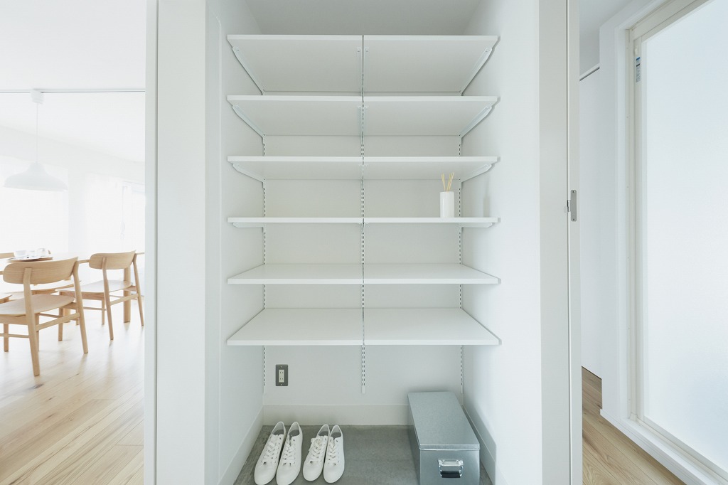 同社が手掛けたのはこの団地の5階の一室。築47年、51.18m2の広さの部屋だ。もとは2LDKの間取りを1LDKに変更している。玄関を開けると目の前には真っ白のシンプルなシューズラック。そして、左に行けばキッチンとLDK、右に進めば直接洗面台に行ける回遊できるつくりが面白い。昨今のコロナ禍では、帰宅したらまずは手洗いやシャワーを浴びるという人も増えていることだろう。そんなニーズにもフィットする間取である。