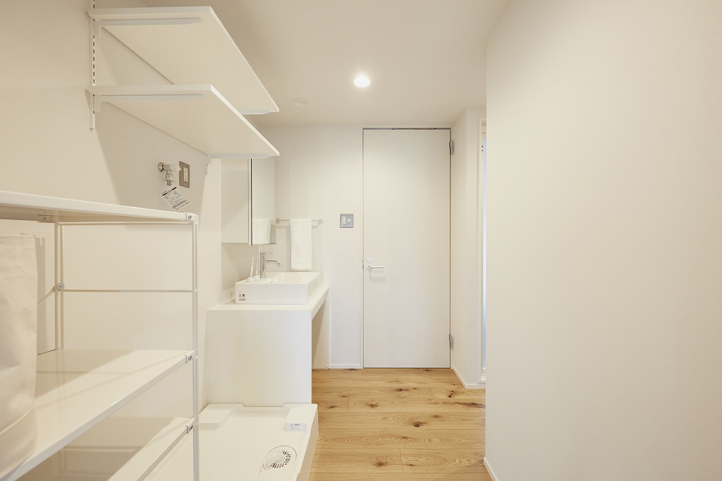 シンプルなキッチンの収納力をカバーするのは、背後に設置された無印良品のラックだ。今回の販売住戸では、家具や家電製品なども備え付けのものが多い。このキッチンラックに乗る電子レンジやポットなども付属する。後述するがデスクやランドリー周りのラック、収納などもあり、寝具と冷蔵庫や洗濯機などいくつかの家電さえ持ち込めば、すぐにでも生活が始められそうだ。