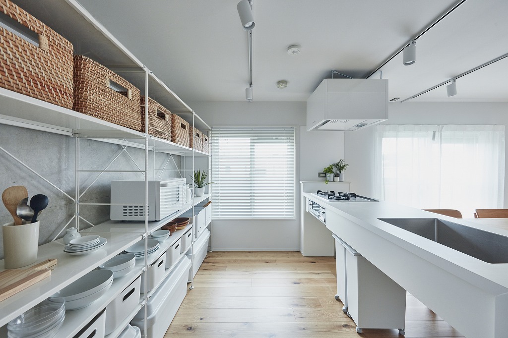 また、3つ目は「スケルトン」へのこだわりだ。配線配管をやり直せることはもちろん、見えない下地などにも目を配れるため、高性能な改修が実現できる。そして4つ目が無印ならではの素材へのこだわりだ。キッチンはURとのコラボ企画「MUJI×UR団地リノベーションプロジェクト」で共同開発したオリジナルキッチンを使用。ドアノブやハンガーなどの金物類も無印のオリジナル。洗面台やユニットバスなどもシンプルながらスタイリッシュという無印らしい世界観で統一される。