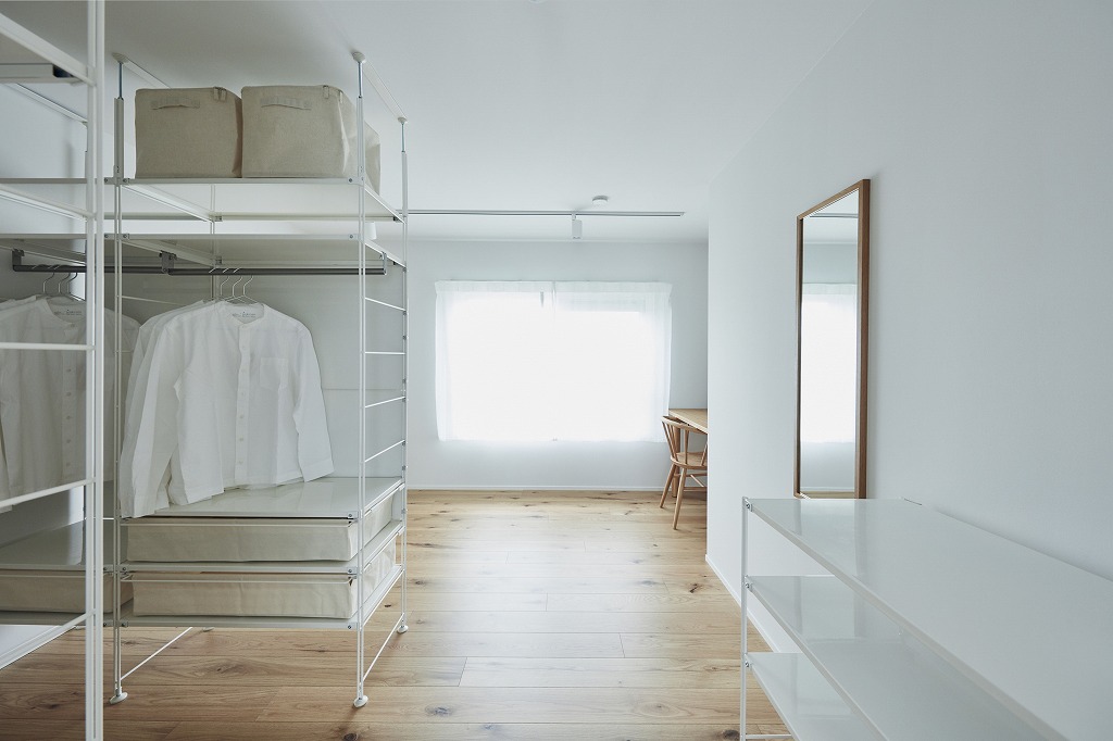LDK隣の個室に入ると、収納が目に入る。通常であれば個室収納といえばクローゼットが用意されているが、ここでは取り外し可能な無印良品のラックが設置されている。部屋の奥には、無垢のデスクとチェアが置かれている。通常であればこのデスクスペースをクローゼットにしがちだが、コンセプトの通り、生活の変化に合わせて家具などで空間を変えやすいように変化しにくい設備はなるべく排除しているのが感じられる。確かに、このコロナ禍ではリモートワークの需要が高く、自宅でもデスク周りのスペースは重要視される。だが状況が変わることも考えられるため、フレキシブルに空間を変えられるのは魅力である。