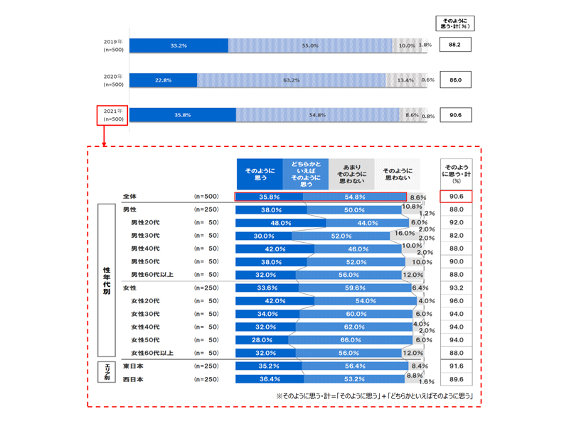 まず、今後の災害増加や被害拡大の可能性の有無については、「どちらかといえばそのように思う(54.8%)」「そのように思う(35.8%)」の合計が90.6%。災害の増加や被害の拡大を懸念する人の割合が2012年の調査開始から初めて9割を超えたという。男性(88.0%)よりも女性(93.2%)の方が、また、西日本(89.6%)よりも東日本(91.6%)が高くなっている。