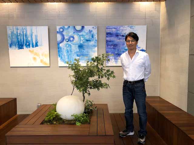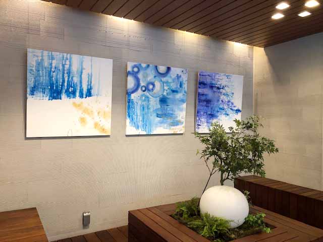 今回、レンタル・販売を含めた展示会場となったのは「パークシティ武蔵小杉ミッドスカイタワー」の1階のエントランスロビー。タワーマンションらしく、天井が高く、高級ホテルのロビーのようだ。ビフォー画像にあるように殺風景だった壁が、アートを飾ることでアフター画像のように美術館の壁のような華やかな空間となった。