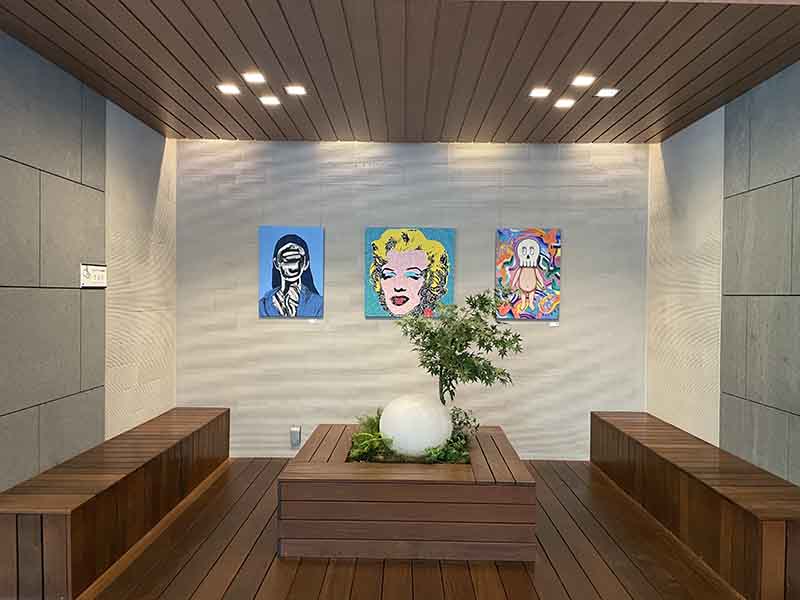 「飾られているアート作品は、このマンションの住人の方であれば、気に入ったらご自宅に1 週間の無料レンタルが可能です。アート作品の詳細は、展示作品の下のQRコードから情報を取得できます。1週間ご自宅にお試し展示後、作品の購入の有無をレンタル最終日に決めていただきます。気に入れば購入していただき、もちろん、購入をせずに返却いただいても大丈夫です」