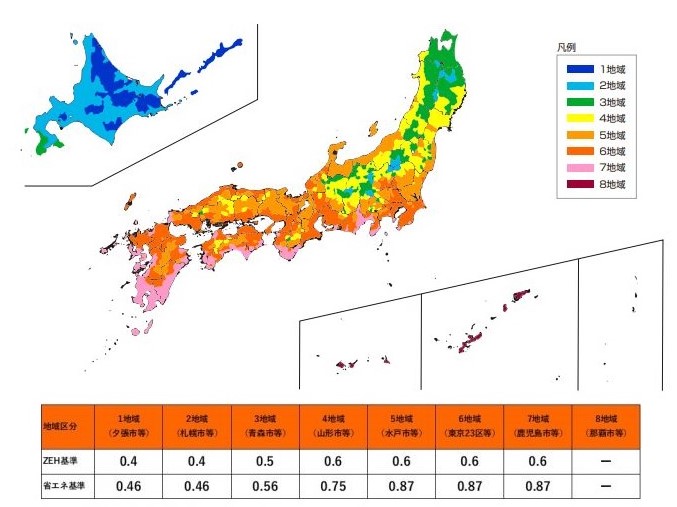断熱性能はUA値(外皮平均熱貫流率)という指標で表される。UA値は数値が低いほど断熱性能が高いことになり、ZEH基準では0.4~0.6W/m2Kを下回ることが求められる。この基準は地域によって異なり、例えば東京23区の場合は0.6 W/m2Kとなっている。