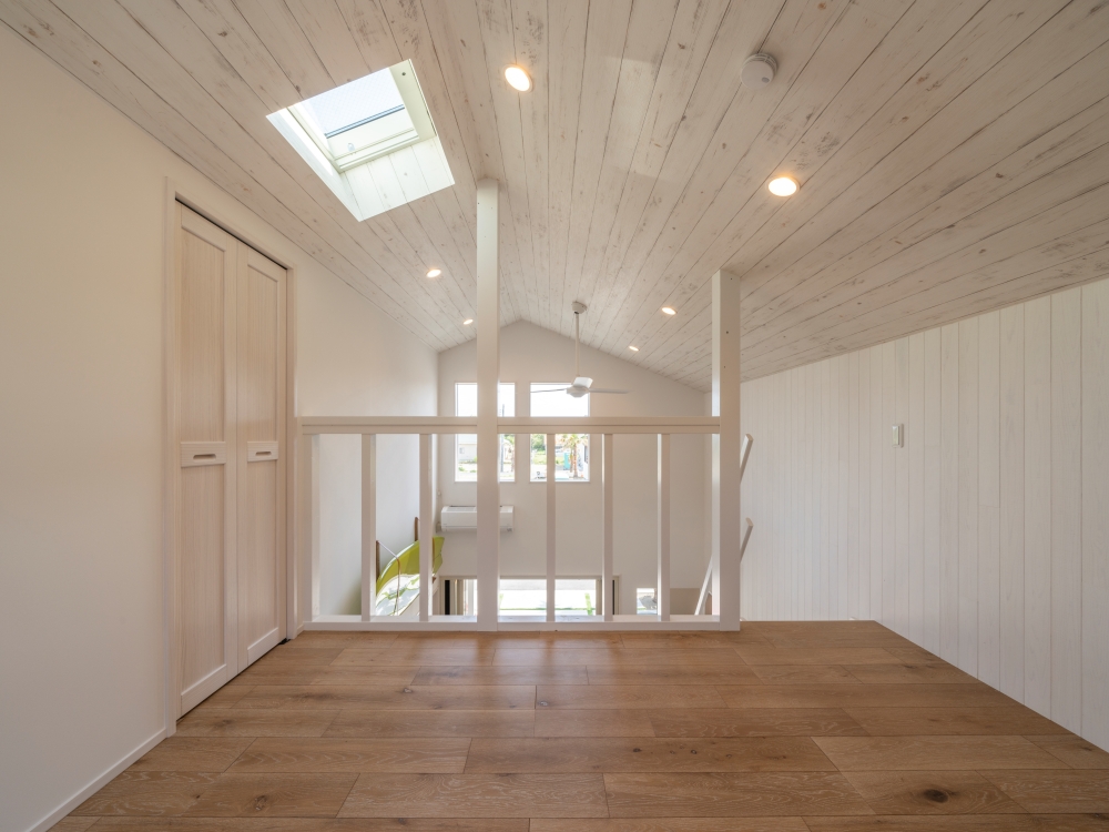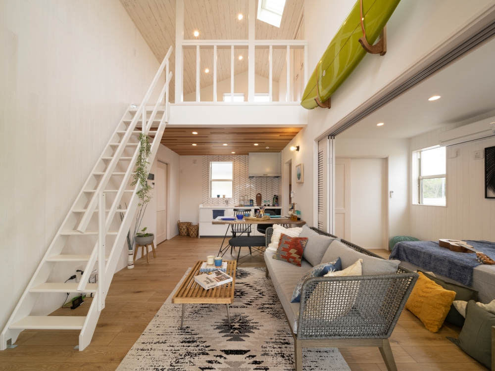 「アパートの入り口周辺に外部シャワーを設置し、1階の部屋は外からベランダを通って室内に入れるようになっています。2階の部屋は玄関から浴室まで、濡れても問題のない床材を使用するなど、サーファーの入居を考えた仕様や動線になっています。2階は勾配天井にして開放感を出しているのも特徴です。アクセスがいいためか1階が人気ですね。