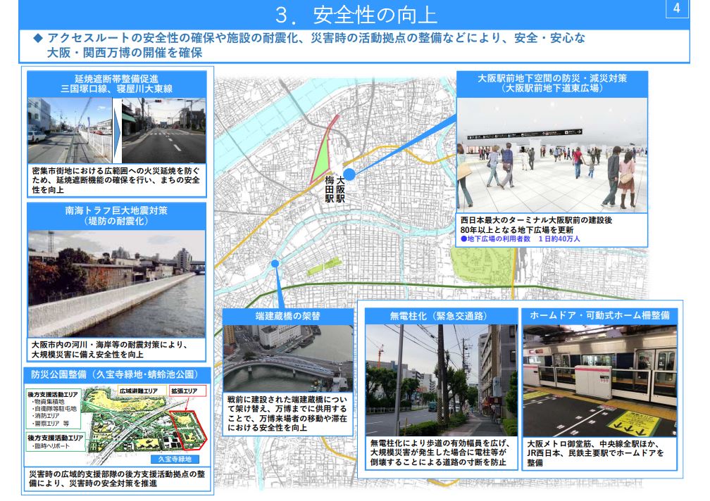 大阪駅前地下道東広場は、建設後80年以上が経過しており、イベント開催を機に更新する。その他、緊急交通路の無電柱化で、災害時の電柱等の倒壊による道路寸断などを防止する。