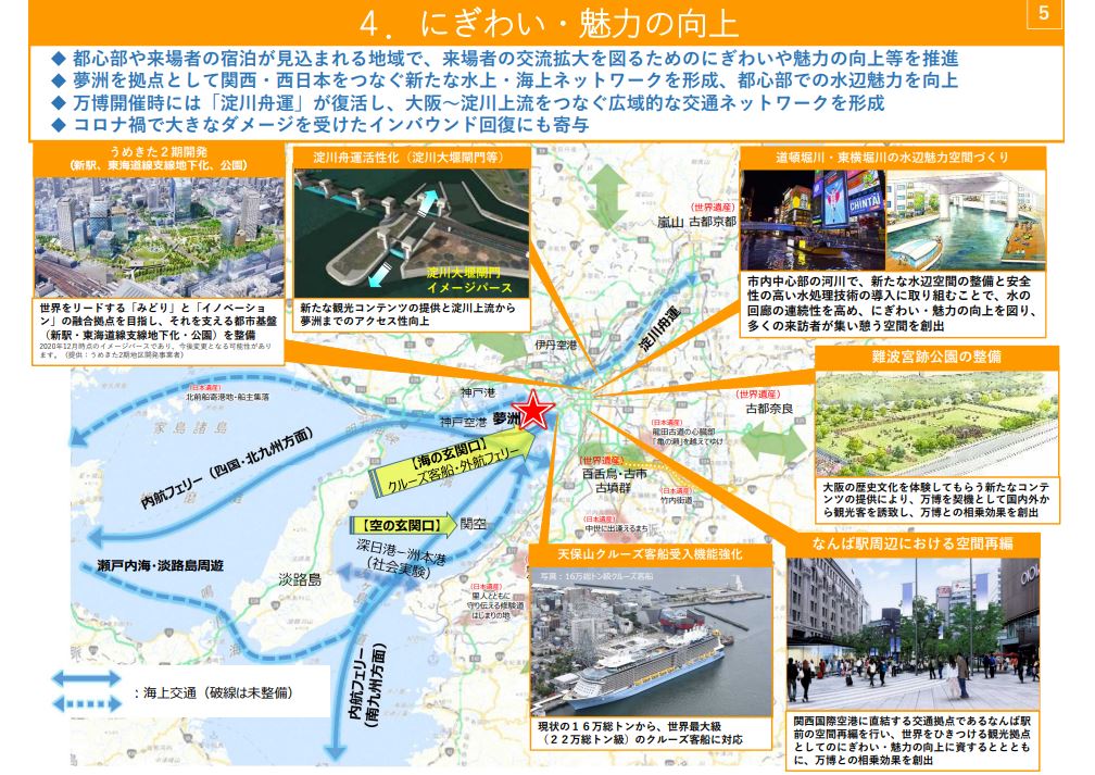 他には、淀川大堰閘門を整備し、イベント開催時には「淀川舟運」を復活。大阪~淀川上流をつなぐ広域的な交通ネットワークを形成する。道頓堀川など市内中心部の河川でも、新たな水辺空間の整備と安全性の高い水処理技術の導入に取組み、水の回廊の連続性を高めることで、にぎわい・魅力の向上を図り、コロナ禍で大きなダメージを受けたインバウンドの回復へ寄与する。