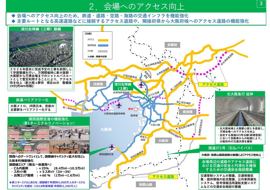 海老江JCTから新御堂筋と接続する豊崎出入口(仮称)を結ぶ阪神高速道路の淀川左岸線(2期)は、もともと2026年度末に完成予定であったが、工事を前倒しし、イベント会場へのシャトルバスルートとして活用する。現在、新大阪から35分を要する会場へのアクセスが19分となり、約46%の短縮を見込む。