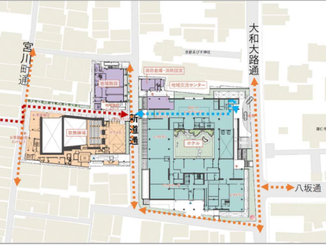 さらに、宮川町歌舞練場の出入り口を移動させ、ホテルとなる元新道小学校跡地と道路対面にさせる。大和大路通、新道通、宮川町通の南北の通りに対して、東西に人の流れを生むような建物の配置を行い、さらに宮川筋・新道通りをつなぐ新たな小路も作られることで、地域の回遊性を向上させる。