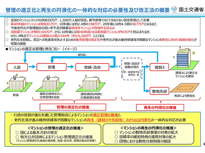 2018年末時点で築40年超のマンションは81万戸となっており、10年後には約198万戸、20年後には約367万戸となることが予想されている。一方で、2019年4月時点で建て替えが行われたマンションは累計で244件(約19,200戸)となっており、約655万戸に対してはわずか約0.3%に留まっている。