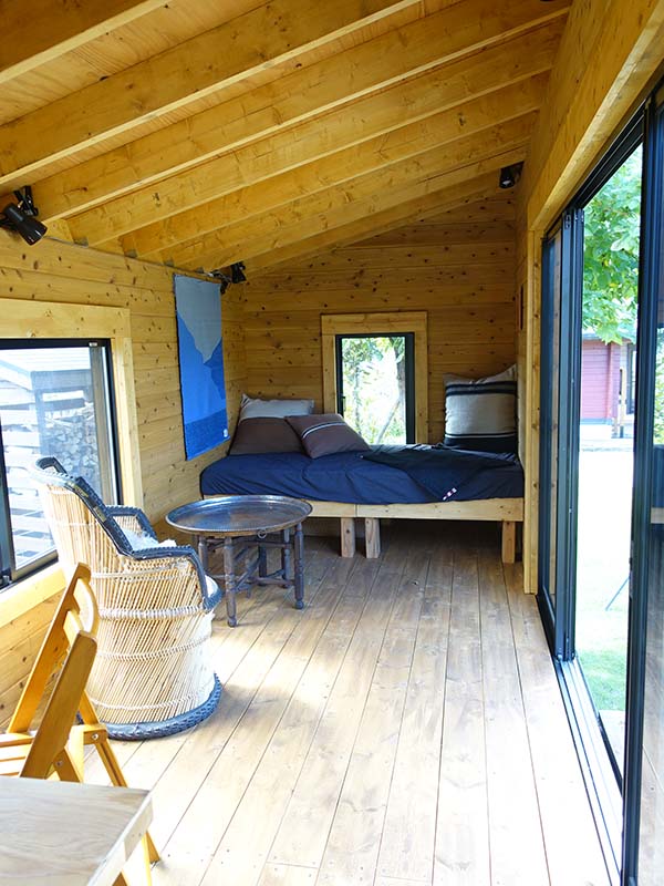 もう一つの走るログ小屋が、20フィートサイズの「IMAGO X」。こちらのメッセージは、「住所不定の自由」。ネーミングのインパクトどおり、一歩足を踏み入れると、確かにここなら暮らせるかもしれないと思わせる空間であった。広さは約5.6m×2m(床面積11.3平米)、7畳ほどの空間が横に広がり、ベッド、ダイニングを置けば十分に生活できそうだ。水道設備はないが、自宅の庭で趣味や仕事に没頭し、快適な一日を過ごせるイメージが沸く。