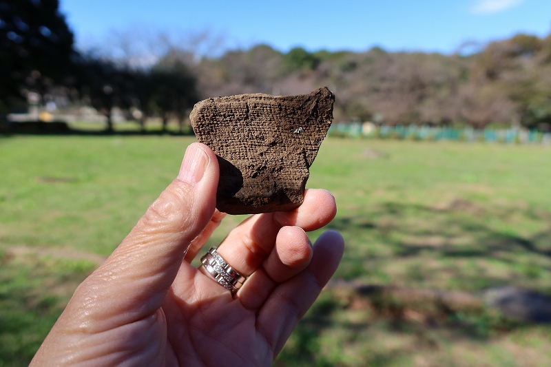 ちなみに国分寺跡ではかつての瓦の破片がたまに見つかるそうで、真貝氏に言われて探してみたところ、それらしきものを発見。持ち帰りたかったのだが、持ち帰ると不幸になるという伝承があるそうで、泣く泣く置いてきた。皆さんも見つけてもくれぐれも持ち帰らないようにしてください。