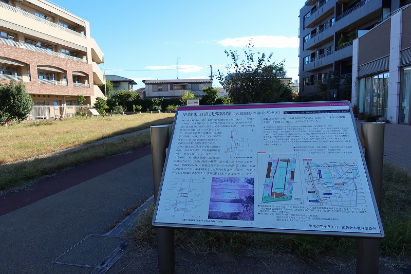 東山道とは7世紀後半に始まり、10世紀ごろまで続いた律令制の下での行政区分および幹線道路を指し、国分寺市での発掘調査で出てきたのはその枝道である武蔵野路。架橋技術が発達する以前は河川の多い東海道を行くより、内陸の東山道を行くほうが合理的であったため、関西から関東以遠をつなぐ幹線道路として使われていたのだ。しかも、側溝間が12mに及ぶ直線道路だったそうで、今の時代の道路として考えても立派なものである。発掘後の道路の一部は異常に広い歩道として残されている。