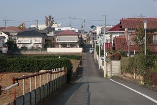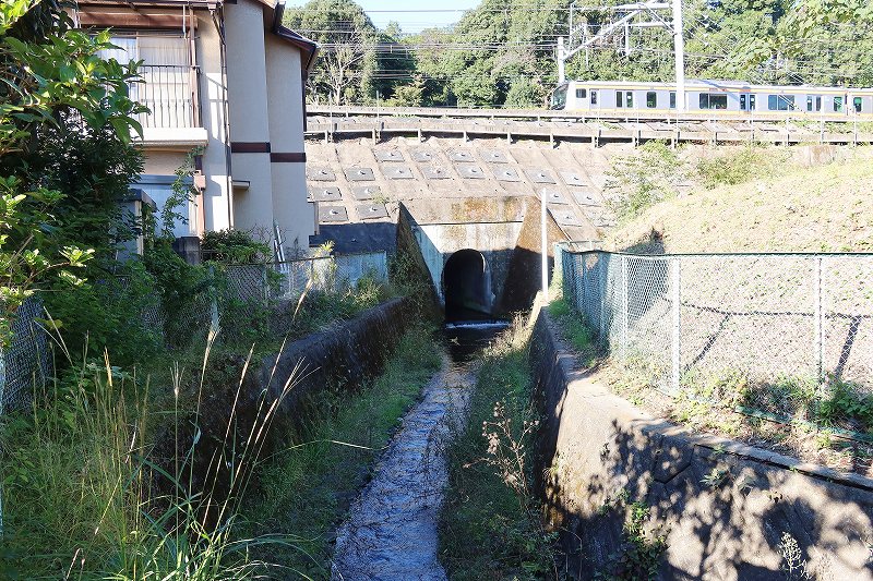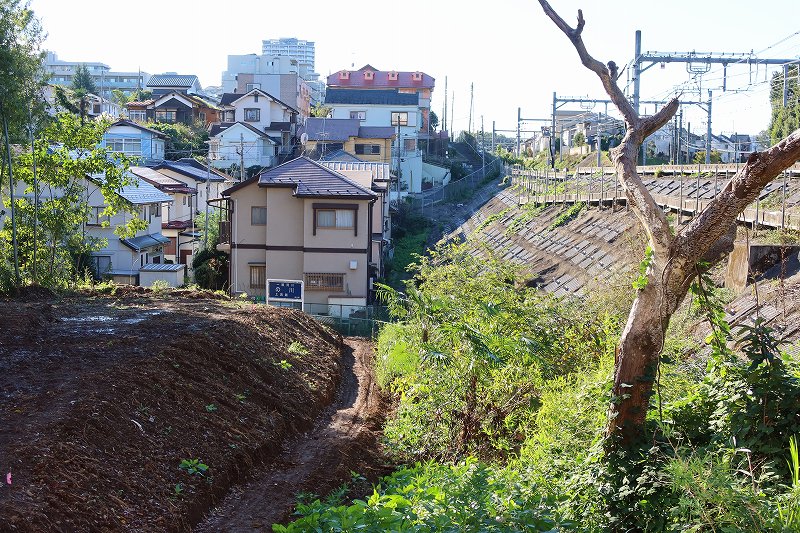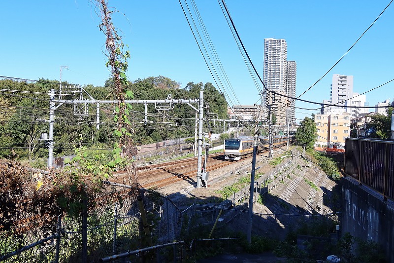東山道から向かうと野川方面へは坂を下ることに。現在の道はかつてに比べればはるかに整備されており、緩やかになっているはずだが、それでも十分に急坂で歩き慣れない人なら息を切らすだろう。一度下りてから線路際を上り、周辺の地形を眺める。野川を底に両側に急傾斜な谷があること、そのはるか上を電車が走っていることが分かる。地形好きにも電車好きにも楽しい眺望スポットだ。