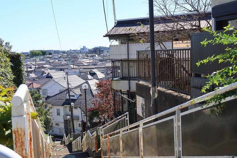 碑とマンホールを見た後は駅の南側に戻り、住所では南町2丁目、周辺からは丸山と呼ばれる小さな台地へ。南側は国分寺崖線に面しており、急坂には長い階段が。見下ろす先は立川面の平坦な土地が広がる。その中、右手にこんもりと見える緑の山は府中市の浅間山。これは多摩川が削り残した残丘といわれ、3つの山からなっているそうだ。