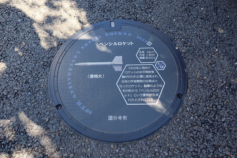 早稲田実業敷地内には打ち上げを記念する碑、周辺にはその時に打ち上げられた全長23㎝(!)のペンシルロケットを描いたマンホールが12ヶ所に配されており、眺めて歩くのが楽しい。
