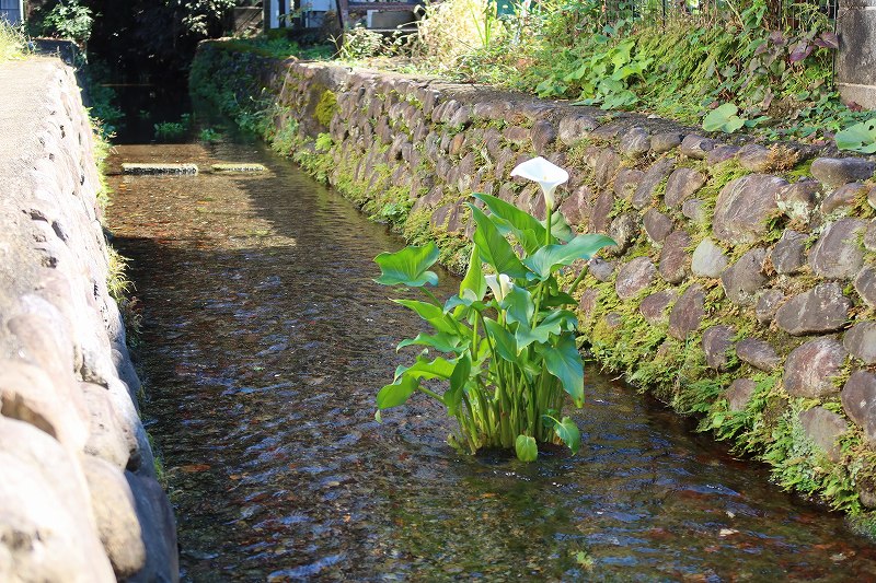 さて、お鷹の道は江戸時代、このあたりが尾張徳川家の御鷹場(鷹狩りをする場所。江戸時代には将軍と大名だけが所有できた)だったことに由来する遊歩道で、道沿いの水路は、元町用水として野川に注ぐ。この水路にも清らかな水が流れており、ところどころには別の湧水、橋、そしてサトイモ科のオランダカイウ(阿蘭陀海芋)なる白い花が咲いていた。