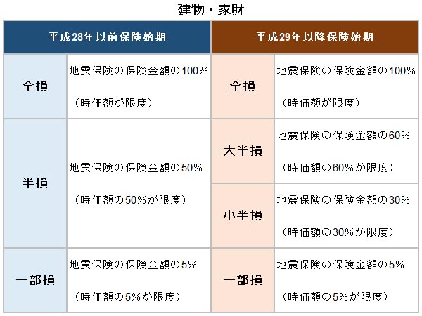 地震保険では、保険の対象である居住用建物または家財が全損、大半損、小半損、または一部損となったときに保険金が支払われる。地震保険に関する法律施行令の改正(平成29年1月1日施行)により、「半損」が「大半損」および「小半損」に分割されたが、支払の範囲は表のとおりとなる。