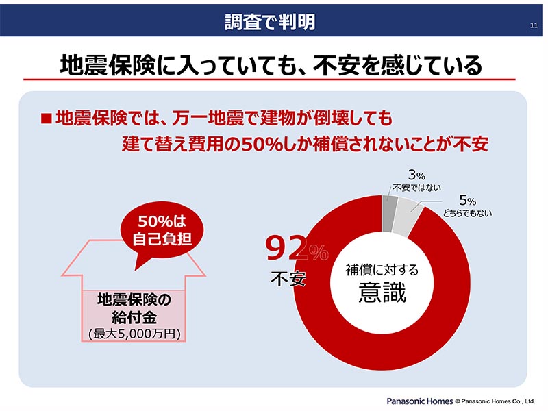 そして、今回、もうひとつ、2019年6月に地震保険に加入している戸建住宅購入者への調査から見えてきたユーザーの不安が“地震保険で住まいの50%しか保証されないこと”でした。地震保険が“生活の再建”であることに対して、お客様達は“住まいの再建”を望んでいることだという、そのギャップがみえてきたのです。