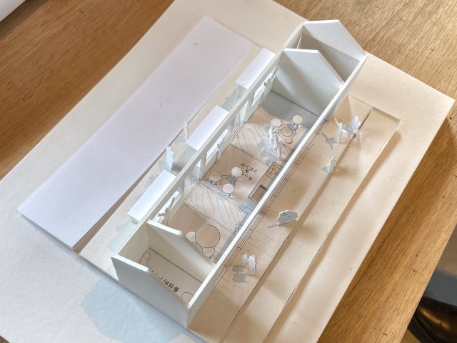 3人が考えたコミュニティハウスのテーマは『長屋台』。同時に複数のお店が出せる長い屋台だ。