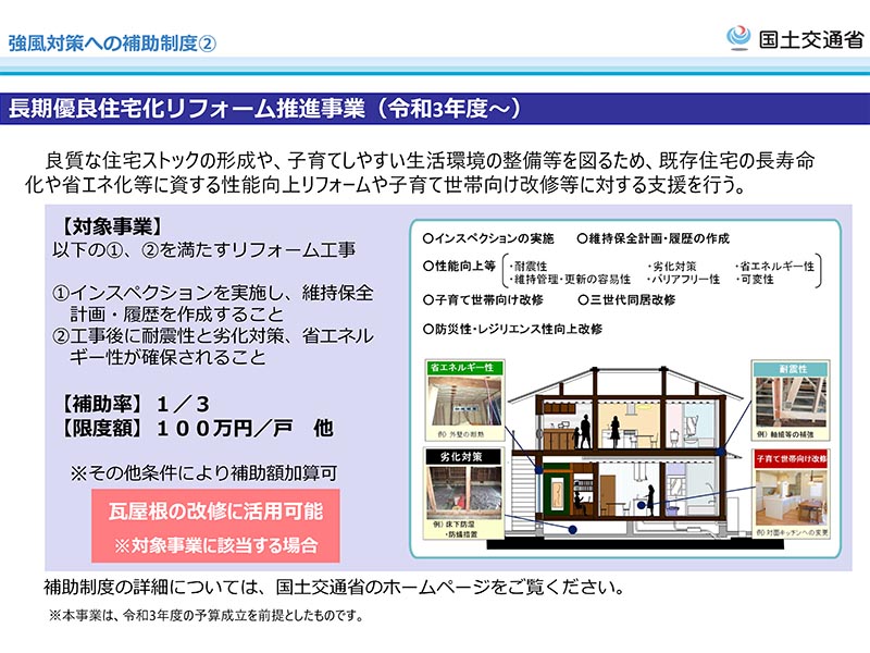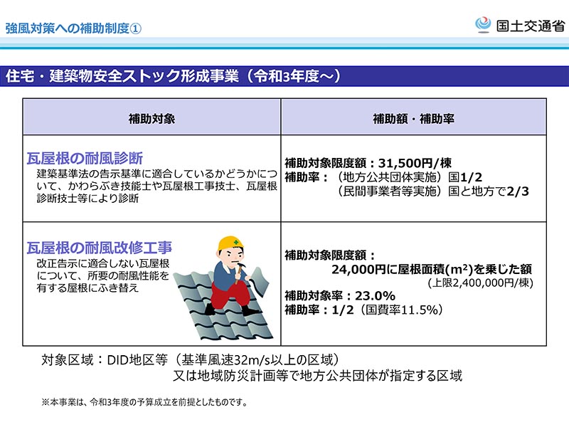 2021年度の予算成立により、「住宅・建築物安全ストック形成事業」が創設されている。住宅・建築物安全ストック形成事業では、一定の地域において瓦屋根の耐風診断と耐風改修工事に補助金が出る。