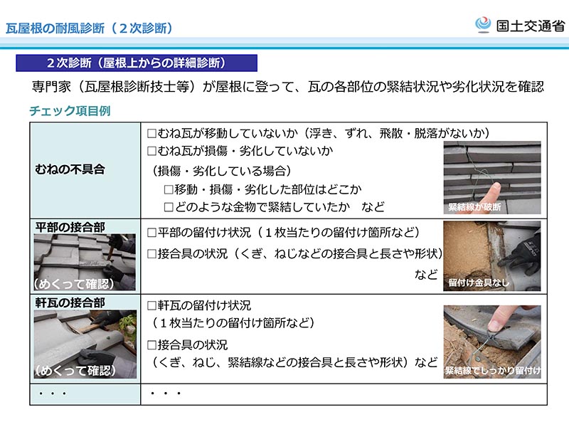 なお、屋根は滑りやすく危険であるため、国土交通省では自ら登ってチェックすることはしないよう強く警鐘している。瓦は専門会社による耐風・耐震診断があるため、不安な方は専門の調査を利用してほしい。